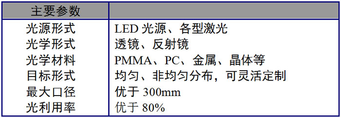 1、采用自由曲面,可实现几乎任意形式的光束整形要求,光利用率高;