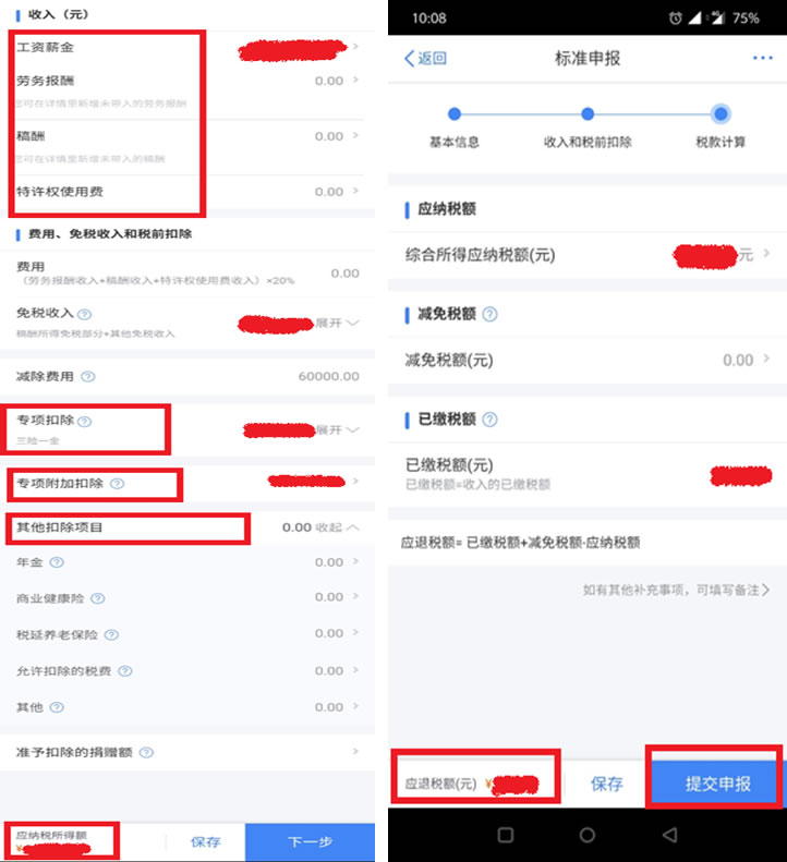 6.收入数据填写完成后,继续根据提示操作,系统会自动计算应补缴和退税金额,个人确认无误后进行补缴和退款操作。