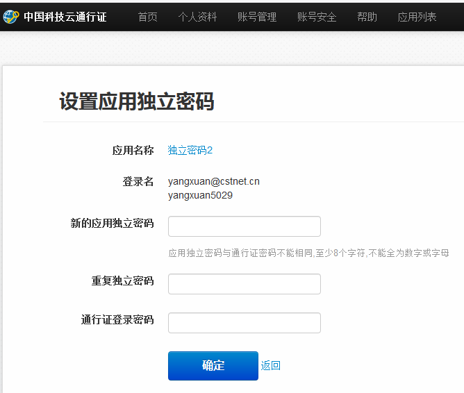 科技云通行证独立授权某应用时,需为帐号单独设置口令,此口令只能作为访问该应用使用,且必须与原有科技云通行证口令不同。