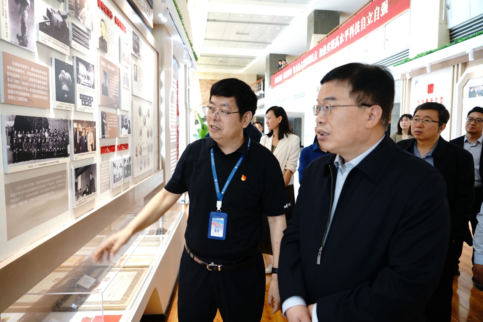 巩守平一行首先参观了西安光机所“向光而行,科技报国”弘扬科学家精神教育基地,马彩文讲述了西安光机所历史沿革、追光逐梦光辉历程,以及研究所在新时期努力抢占科技制高点、履行战略科技力量使命担当中展现的弘扬老一辈科学家精神的感人故事。