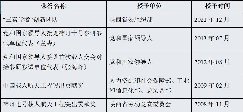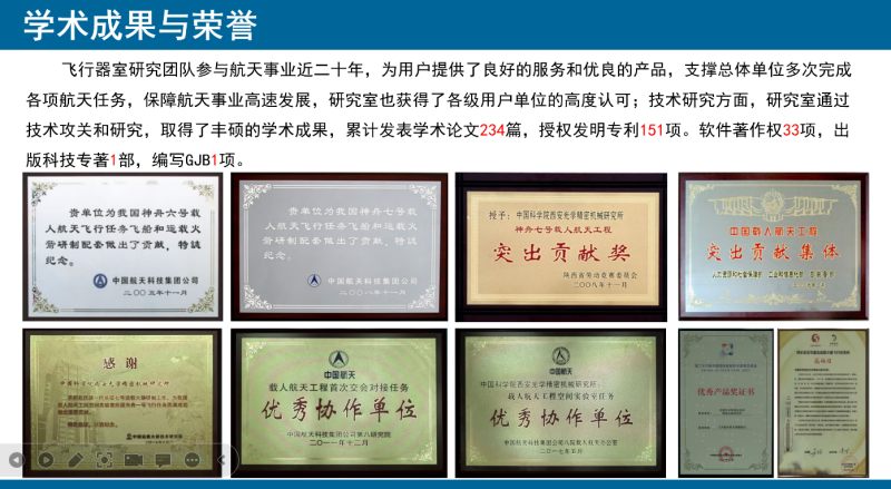 飞行器室研究团队参与航天事业近二十年,为用户提供了良好的服务和优良的产品,支撑总体单位多次完成各项航天任务,保障航天事业高速发展,研究室也获得了各级用户单位的高度认可;获得各级奖励12项,团队核心成成员多次受国家领导人接见。