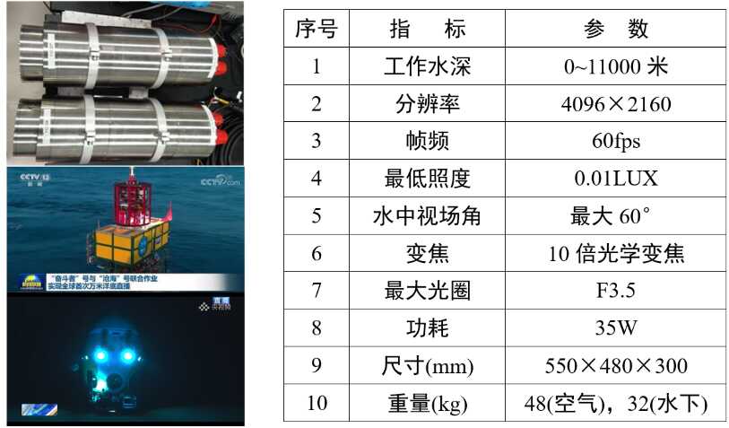 全海深高清视频摄录设备突破了超高清水下成像技术、全海深大孔径光学耐压干舱等核心技术,实现了深海大视场、高分辨率变焦成像,低噪声、高对比度的深海图像增强,深海图像色彩复原。该设备作为唯一的直播设备搭载在“沧海号”着陆器上,见证了我国载人潜水器“奋斗者号”首次万米深潜,世界首次实现了万米深海直播。直播画面通过央视展示,清晰度高、连续无卡顿,以高质量的视频画面向全人类展示了我国深海探测能力。