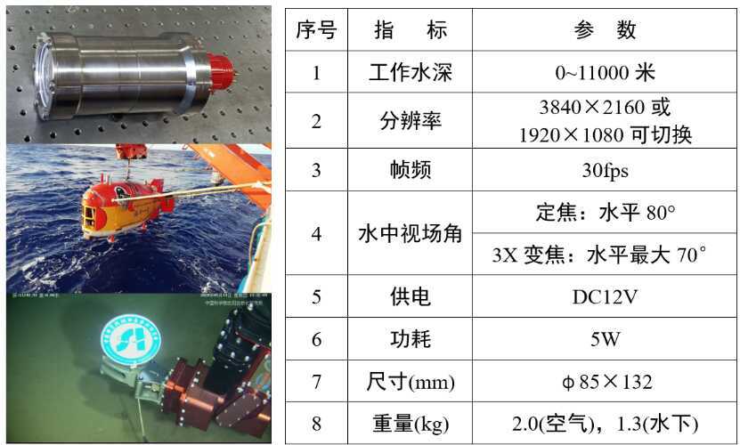 小型全海深超高清相机是在“海瞳”相机基础上通过小型化、模块化和可靠性设计,形成的系列化装备。目前已作为重要的图像采集设备搭载于多型ROV、AUV、着陆器及其他平台上,为深海作业、状态监控、过程记录提供了清晰、稳定的视频/图像。