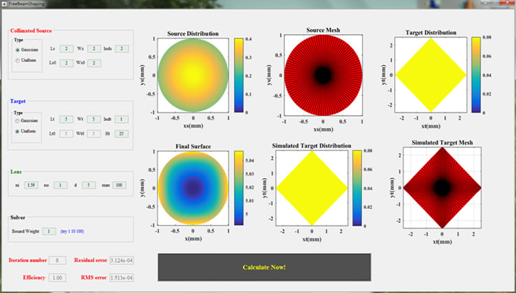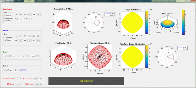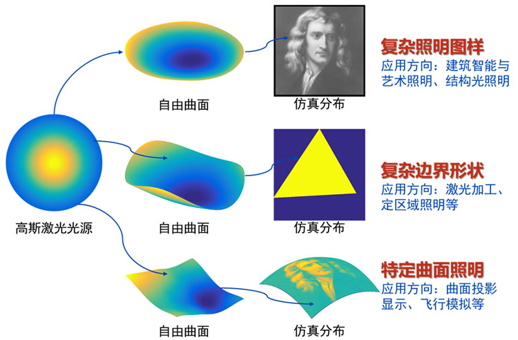 针对常见光源(如LED、固体激光、光纤激光等),基于光线定向调控思想计算自由曲面透镜或反射镜,对光源的空间光能分布进行再分配,以在指定的目标平面或曲面内形成指定的能量分布样式,满足复杂光束整形应用的要求,目前在国内处于领先水平。