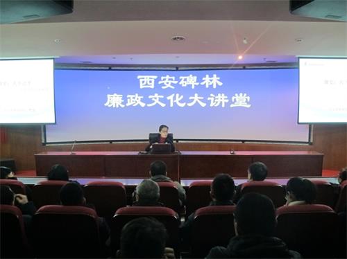 全体人员首先走进“西安碑林廉政文化大讲堂”,观看了廉政教育专题片,了解中国传统家训、红色家风,感受古人先贤的齐家治国之道和革命先烈舍小家保大家的家国情怀,并聆听了碑林博物馆樊波研究员所作的《中国古代监察制度》专题讲座,学习了我国唐代及元代的监察制度及对御史台官员的有关管理规定。