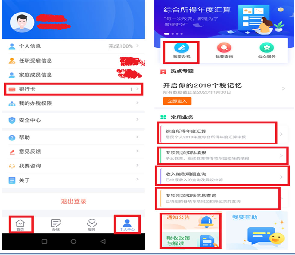通过https://etax.chinatax.gov.cn/下载个人所得税APP并安装登录,在“个人中心/银行卡”下可按提示添加银行卡。在首页点击“专项附加扣除信息查询”可查看相应年度的专项附加扣除信息,点击“专项附加扣除填报”可填写大病医保等尚未申报的专项附加扣除信息,点击“收入纳税明细查询”可查看已经在税务系统中申报的综合所得收入信息,点击“综合所得年度汇算”可办理综合所得年度汇算,点击“通知公告”和“税收政策与解读”可查看相关公告和政策。也可在办税页签下选择相应选项办理。