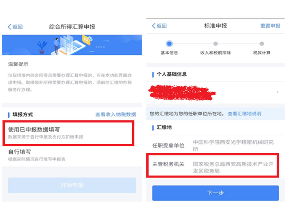 1.核实完成各项专项附加扣除和已申报的收入信息后,就可以进行综合所得年度汇算申报了。在首页点击“综合所得年度汇算”可开始综合所得汇算申报,推荐使用已申报数据填写,确认个人信息、受雇单位和主管税务机关后点击“下一步”进入收入和税前扣除填报界面。