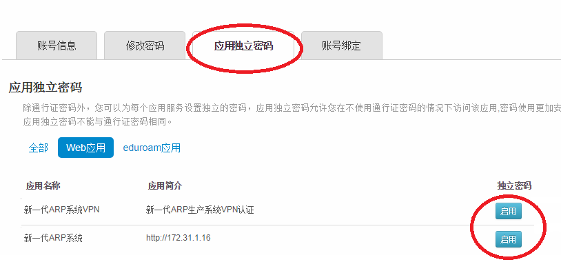 依次点击:帐号管理-应用独立密码,进入设置应用独立密码界面,找到新一代ARP系统VPN和新一代ARP系统,如下图: